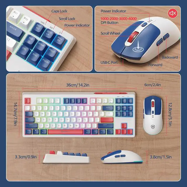 ^^ RGB Lighting: The keyboard mouse set is equipped with rainbow lighting and light up your desktop in dark environment. You can adjust the lighting by pressing backlit keys, detailed method please scroll down to product description.