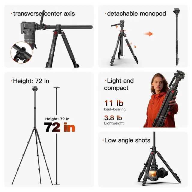^^ [Multiple Application]: This horizontal tripod features a removable center column that adds to its versatility. Beyond standard shooting, the column detaches and combines with the legs to form a monopod for cameraor even a hiking pole. When inverted, it enables stable low-angle shots. Perfect as a 2-in-1 camera tripod & monopod, it adapts to any scene instantly.