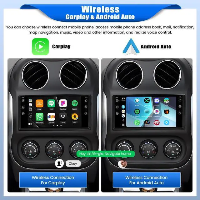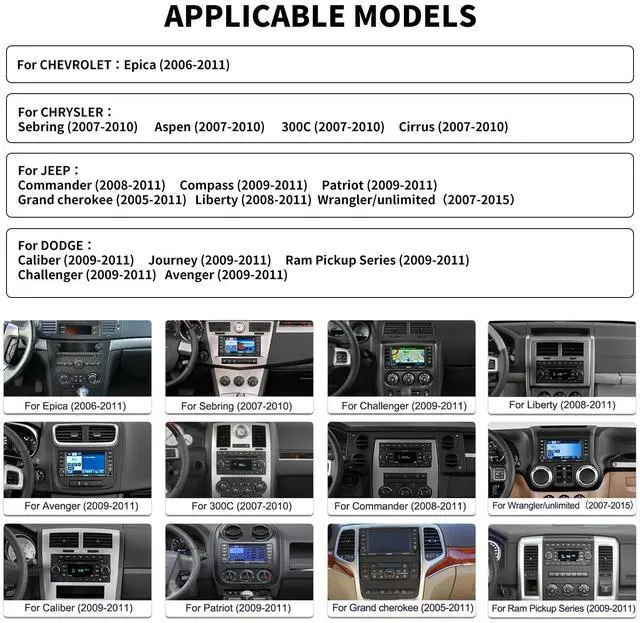 Android 15 For Jeep Wrangler JK Compass Patriot/Chrysler/Dodge RAM ChargerThe carplay car stereo fits for CHEVROLETEpica (2006-2011), CHRYSLERSebring (2007-2010), Aspen (2007-2010), 300C (2007-2010), Cirrus (2007-2010), JEEPCommander (2008-2011), Compass (2009-2011), Patriot (2009-2011), Grand cherokee (2005-2011), Liberty (2008-2011), Wrangler/unlimited2007-2015, DODGECaliber (2009-2011), Journey (2009-2011), Ram Pickup Series (2009-2011), Challenger (2009-2011), Avenger (2009-2011) ^^ Compatible with Wireless Carplay & Android Auto&Mirror LinkThis car stereo supports CarPlay/Android Auto function. Just connect Bluetooth, you can project the contents of your phone to the large screen of the host, and you can share your favorite 1080P videos, high-definition pictures, etc.