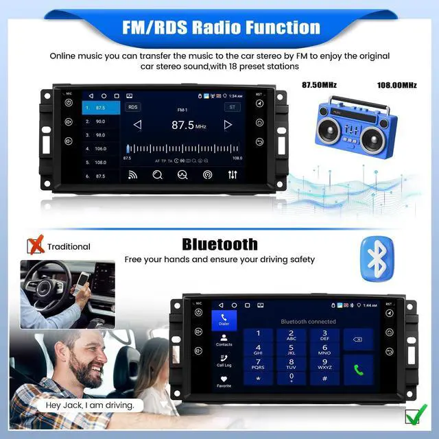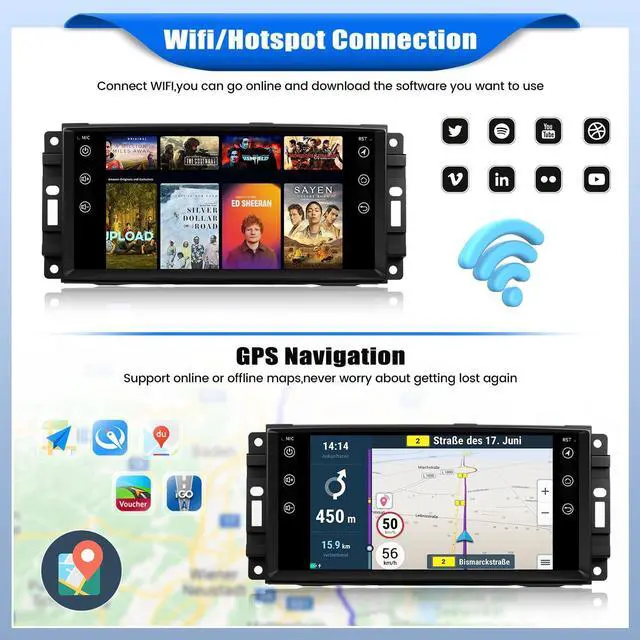 Upgrade dual system mirror link: IOS/Android mirror link ^^ GPS Navigation & WiFi Connect7 inch car stereo for Jeep Wrangler JK Compass Patriot/Chrysler/Dodge RAM Charger built-in WiFi module, support online/offline maps. Built-in Offline Map of North America. Online map also be supported, after connected to WiFi, you can use GPS Navigation at anywhere. This item allow install or delete android apps from Application Store, as the same as smart phone ^^ EQ Setting&DSPCar DSP tuning software, using DSP tuning technology, you can adjust the frequency, AE, 32-band equalization, and sound type selection on the app to make up for the lack of the original car speakers and obtain better lossless sound quality. Smart voice assistant, you can voice control it to make calls, control map navigation, send text messages, etc. It can better liberate your hands and achieve safe driving ^^ FM/RDS Radio Receiver &BluetoothBluetooth allows you effectively share music from mobile phone to the car stereo, answer phone call by hand free, calling and hang up phone with just one push of a button, daily driving easier and safer. Build in FM, automotive level chipset provides the best radio signal reception performance, lets enjoy the best FM station and and drive with the rhythm of the city ^^ Steering Wheel Control &AHD Rear View CameraThe car radio for Jeep Wrangler JK Compass Patriot/Chrysler/Dodge RAM Charger supports the car steering wheel to remote control the radio panel, including switching songs, switching channels, adjusting volume, answering calls, etc.
