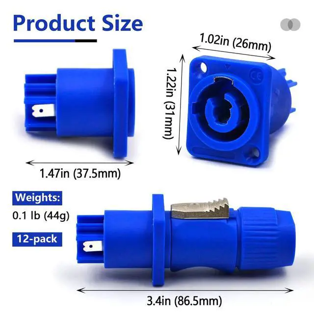 Upgrade your stage lighting setup with these 3 PIN AC Powercon Connector Male Plugs. These blue connectors are compatible with NAC3FCA, NAC3FCB, NAC3MA-1, and NAC3MPB-1 models, making them a versatile choice for connecting LED screens and stage lights. Crafted with durability in mind, these 12 connectors will ensure a reliable power connection for your equipment. With a secure locking mechanism, you can rest assured that your connections will remain stable, even during intense performances or events. Streamline your setup and enhance your lighting experience with these high-quality 3 PIN AC Powercon Connector Male Plugs.