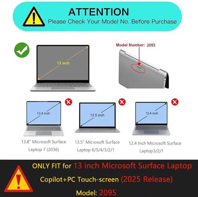 Special attention! Special attention! This case ONLY FIT for Microsoft Surface Laptop 13 inch Copilot+PC 2025 (Model 2095) release he case is NOT compatible with any other Microsoft Surface models. Please kindly CHECK the model number at the bottom of your laptop before purchase. Fully access to all ports and features, plug your cable or headset without removing the case. Add rich graphic colors to your laptop case, but also can protect your computer from breaking to using daily, working or travel. It is nice choice for youWith rubber anti-slip pads on the bottom, your laptop remains stable on any surface.