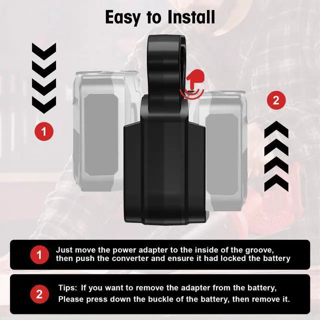(Tips: If it is not in use, remove the battery adapter from your battery, or it will drain the battery; the adapter cannot battery charging, output only)