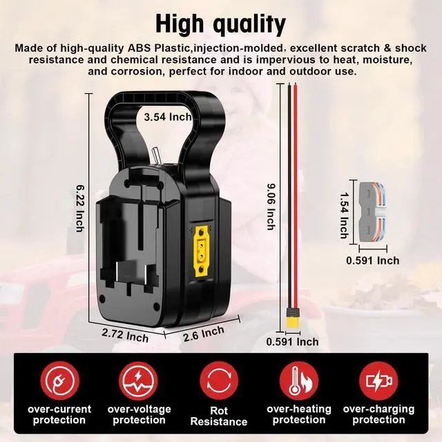 ^^ Multi-protections for SafetyOur 2-in-1 Power Wheel adapter Made of high-quality materials, built-in multiple protections, such as over-voltage, over-current, over-charge and short circuit protections etc to protect your tool from damaging. Safe to use without any worry ^^ Widely used 2-IN-1 power wheels adapter has 14 gauge 20CM wire installed, Maximum permissible current 30A, can use it to upgrade your power wheels, rc toys, work lights or Robotics DIY with enough power.