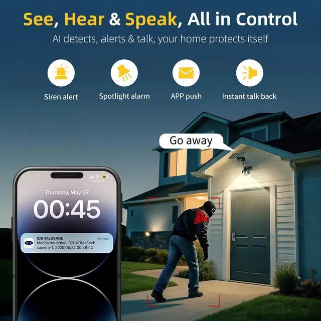 With dual storage options, you control security your way. ^^ Triple Alert System & AI PIR Motin Sensor Activate customizable alarms: high volume siren, spotlight warnings, and instant app notifications. Our outdoor security camera wireless features 355 horizontal and 90 vertical rotation for panoramic monitoring. AI heat-sensing detects humans, animals, or moving objects, while two-way talk lets you confront visitors or calm pets remotely via the app. ^^ Multi-User Access & Easy Setup Share access with unlimited users for real-time monitoring via the app. This wireless camera for home security requires no complex wiringjust mount it and go. With IP66 waterproofing, its built to endure harsh outdoor conditions while keeping your property safe 365 days a year.