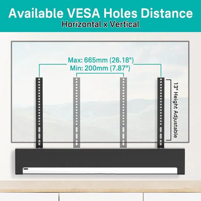 Perfect Fit: Soundbar TV mount bracket is specifically designed for the Sonos Playbar tv mount, fit for the TVs that the horizontal adjustable distance between 200mm to 665mm, ensures a perfect fit and seamless integration with your TV setup, immersing yourself in cinematic sound that moves with your TV bracket.