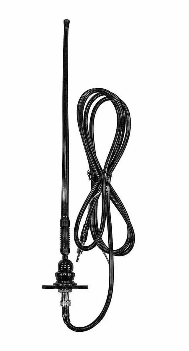 This Jensen AM/FM RV Antenna has a rubber mast which can be used for either a top or side mount. The cable length is a little over eight feet long and it comes with a ground wire. It includes all mounting hardware for a quick and easy installation. The total length of the mast itself is about sixteen and a half inches tall. The diameter of the mounting section is about two and three quarter inches in diameter.