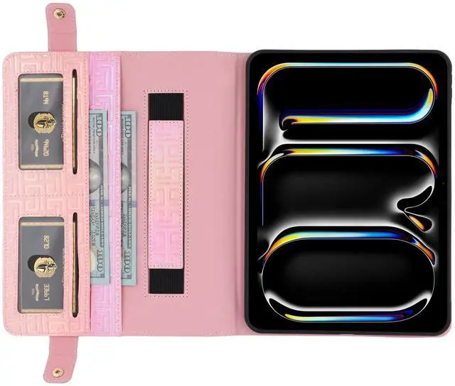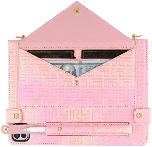 Wallet Design: An envelope pocket external allows you to store your passport and some paper files; also a pencil case pocket designed for Apple Pencil 2 or Apple Pencil Pro; interior with multiple slots for holding your cards and cash.