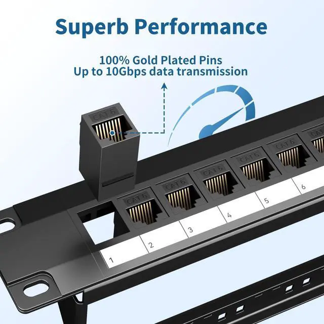Gold-Plated Keystone: RJ45 Patch Panel features gold-plated keystone contacts that ensure corrosion-resistant, reliable connections and support network speeds up to 10G Ethernet. This high-performance patch panel meets or exceeds Cat6 standards, with removable keystone couplers for easy upgrades or replacements.