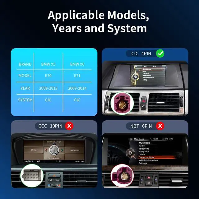 Pre-purchase NoticeThis touchscreen is a 12.3 -inch Linux car display upgrade accessory for BMW models. Applicable to BMW X5/X6 Series (2009-2013), chassis code E70/E71, models equipped with CIC system with 4-pin LVDS cable. If you are not sure about your vehicle system, please consult us. If you are not sure how to install it, you can watch the instructions and installation video we provide. ^^ Built-in CarPlay and Android AutoThis product supports wireless and wired CarPlay and Android Auto, allowing you to seamlessly connect your smartphone to the car system, whether it is iOS or Android system.