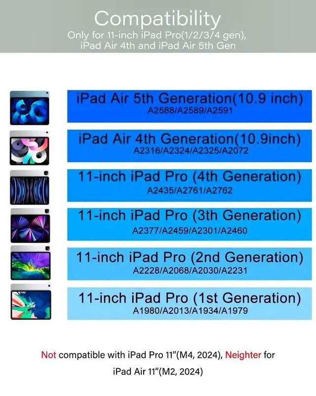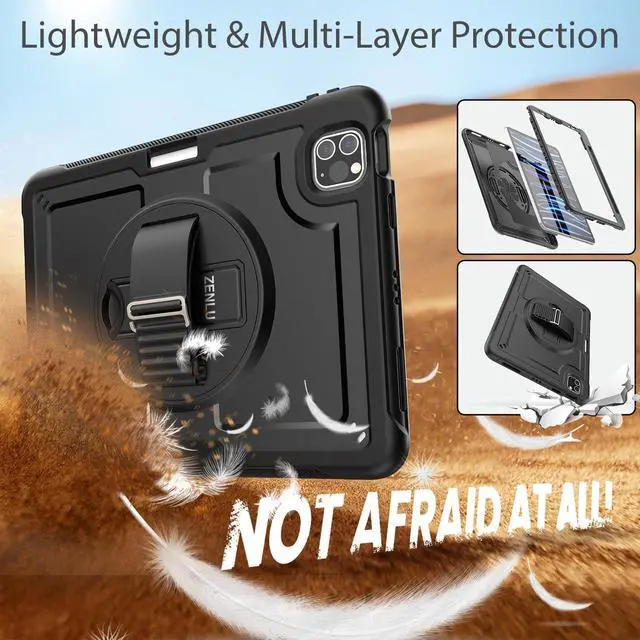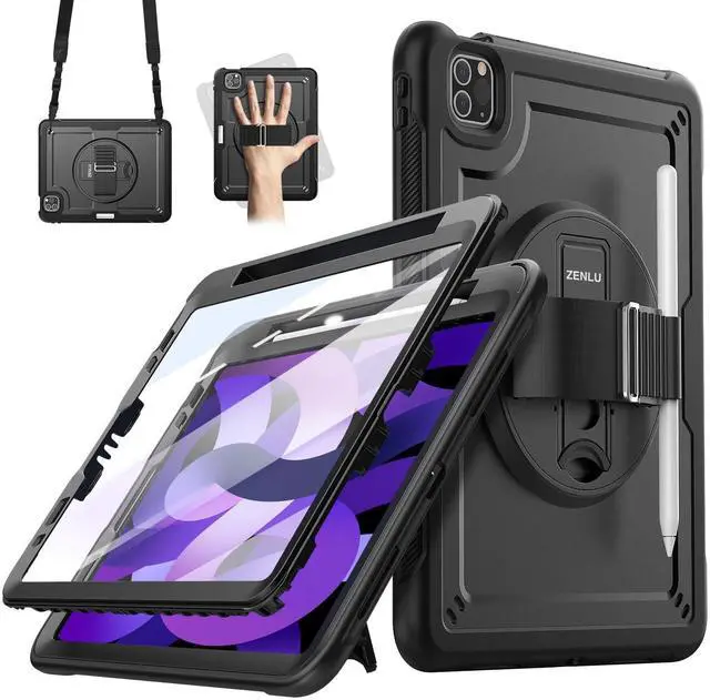 Compatibility: ZENLU's Multilayer Rugged Case is specifically designed iPad Air 5th Generation (2022), iPad Air 4th Generation (2020), and iPad Pro 11 inch (2022/2021/2020/2018); models: A2435, A2761, A2759, A2316, A2324, A2325, A2072, A2377, A2459, A2301, A2460, A2068, A2228, A2230, A2231, A1980, A2013, A1934, A1979. Elevate your tablet's safety with our case, offering 5 ft drop resistance without compromising on style. Tailored for the 10th Generation iPad, our case boasts a sleek design, ensuring lasting durability while enhancing your device's look. The hand strap allows for one-handed usage of your iPad with the convenience of a buckle-style adjustment offering 18 different levels of tightness. Meanwhile, the detachable and adjustable shoulder strap provides extra security when carrying your tablet during hiking, traveling, or other outdoor activities. Rest easy knowing all materials are environmentally friendly and ROHS certified. With ZENLU's iPad case, enjoy our 30-day return or exchange policy and a comprehensive 1-year warranty, guaranteeing your satisfaction. ZENLU's new Multilayer Rugged Case envelops your iPad in three layers of defense, safeguarding it against bumps, drops, and scratches. Experience peace of mind with comprehensive protection, coupled with a lighter weight design featuring a screen protector, flexible TPU, and hard PC cover.