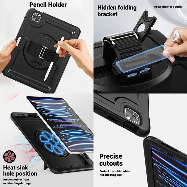 The sturdy kickstand rotates 360 degrees, allowing hands-free support for your iPad while watching movies, playing games, or typing, ensuring convenience in every situation.