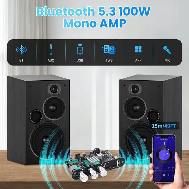 Bluetooth5.3 Mini Amplifier Board 100W Mono Power Amp with TWS Box, Karaoke Audio Amps Module with Boost for Home/Outdoor DIY Speakers, DC 9-24V, MIC and Reverb, Supports BT/USB/AUX Inputs