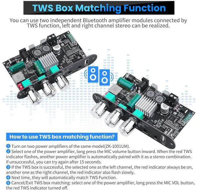 TWS BOX FUNCTIONThis ZK-1001UM is a mono amp, this power amplifier module support TWS BOX mode, this couple of ZK-1001UM mono power amps, you can use this two independent Bluetooth power amplifier boards connected by TWS box fu
