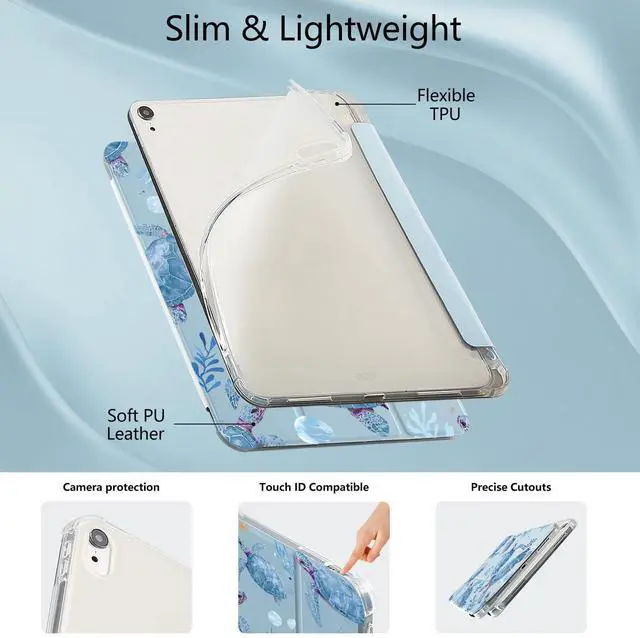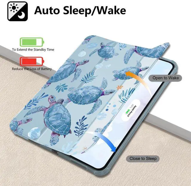 Automatic sleep/wake up&built-in pen holder: This cute sea turtle print case for ipad can be opened without touching a button. When the case is opened, it will automatically wake up. When you close it, the pad will automatically enter sleep mode. Helps to extend battery life. This cartoon Blue Waterweed case for ipad has a hidden slot designed specifically for storing pencils, making it easy to carry pencils with you.
