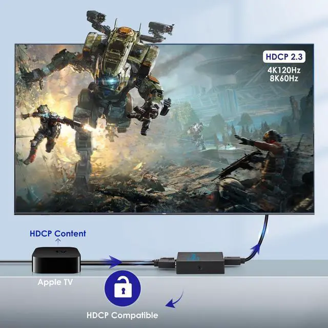 supports 8K30Hz 40962160@60hz( 4:4: 4), 3840x2160@30Hz, 4K@60Hz, 4K@30Hz, 1080p@144Hz, 1080p@120Hz, 1080p@60Hz, 1080p@30Hz, 720p; Supports HDMI 2.1, 40Gbps bandwidth, 3D, HDR, HDCP 2.2, HDCP 2.3 bypass; Please use hdmi 2.1 cable to get the best visual experience; ^^ A/V Receiver CompatibleConnect your PS 5 or other game consoles to this hdmi splitter, and connect hdmi outputs to 8K/4K TV and A/V receiver, then you can enjoy 8K/4K image and high fidelity sound while gaming;