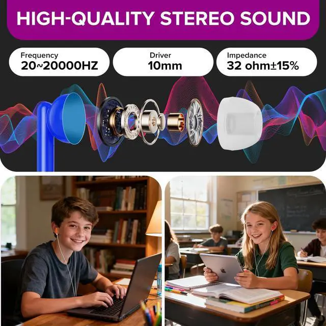 • Comfortable Fit:Ear earbud of student headphones are made of soft silica gel pads for a comfortable fit;and don't have a built-in microphone;Providing clear sound that does not feel jarring and is suitable for your everyday