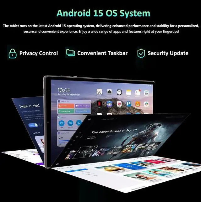Android 15 with AI AssistantRuns the latest Android 15 system with integrated Google Gemini AI for voice control and smarter multitasking. Powered by a T615 octa-core processor for smooth performance. ^^ 11-inch FHD Eye-Care DisplayFeatures an 11-inch FHD screen with 380 nits brightness and TUV Low Blue Light certification. Widevine L1 support enables HD streaming on Netflix and YouTube, paired with dual speakers. ^^ 36GB RAM + 256GB Storage, Expandable to 2TBIncludes 12GB physical RAM + 24GB expandable RAM and 256GB internal storage. Supports up to 2TB microSD expansion. Run up to 15 apps smoothly and store thousands of photos or movies.