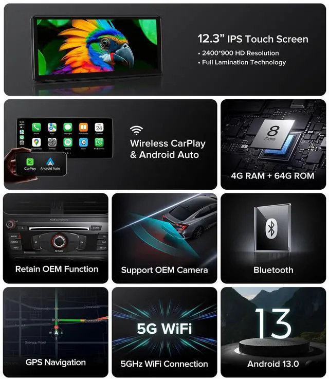 Note: Not for MMI 2G systems (CD Changer in glovebox). Please verify your center console layout before purchase ^^ 12.3" 2400x900 Blue-Ray Visuals Transform your dashboard with the market's clearest display. The 12.3 -inch Blue-Ray IPS Touchscreen features an ultra-high 2400x900 resolution and 700-nit brightness. Anti-glare technology ensures maps look crisp even in direct sunlight, offering a visual experience 3x clearer than standard HD screens ^^ Wireless CarPlay & Android Auto Freedom Modernize your Audi. Connect automatically via Bluetooth 5.0 /WiFi for Wireless CarPlay and Android Auto. Use your original MMI Knob and Steering Wheel Buttons to control Waze, Spotify, and Calls. Keep your eyes on the road while enjoying smart features ^^