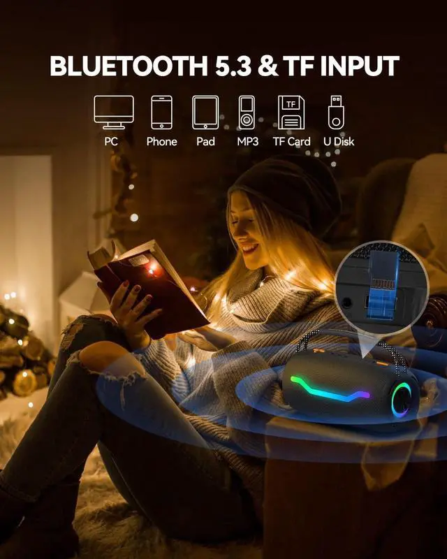 ^^ Long-lasting Playtime & Extended Bluetooth ConnectivityExperience extended playtime with up to 18 hours per charge and extended wireless range with Bluetooth 5.3. The multicolor lights on the speaker can also be turned off with a simple button press to save the battery and adapt to your needs. Keep in mind that the actual playtime can vary depending on volume level, audio content, and usage. ^^ Vibrant Light EffectsBring a new level of excitement to your party with the dynamic multi-color light show that syncs to the beat of the music, you can easily customize the light effects to suit your preference by simply pressing the Light button.