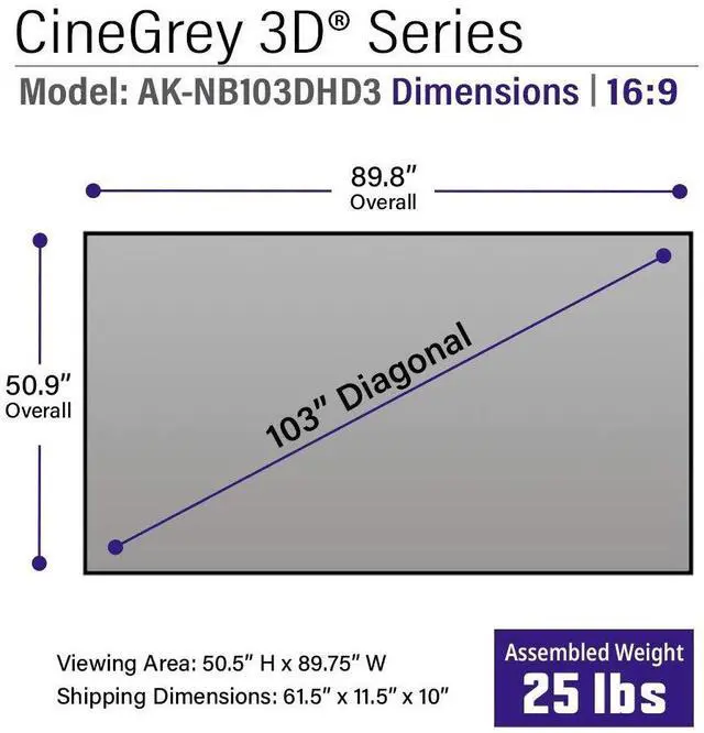 Overall size: 50.9" H x 89.9" W x 1.3" D. Black velvet-wrapped aluminum frame enhances perceived contrast and absorbs projector overshoot. ^^ CineGrey 3D CLR/ALR for