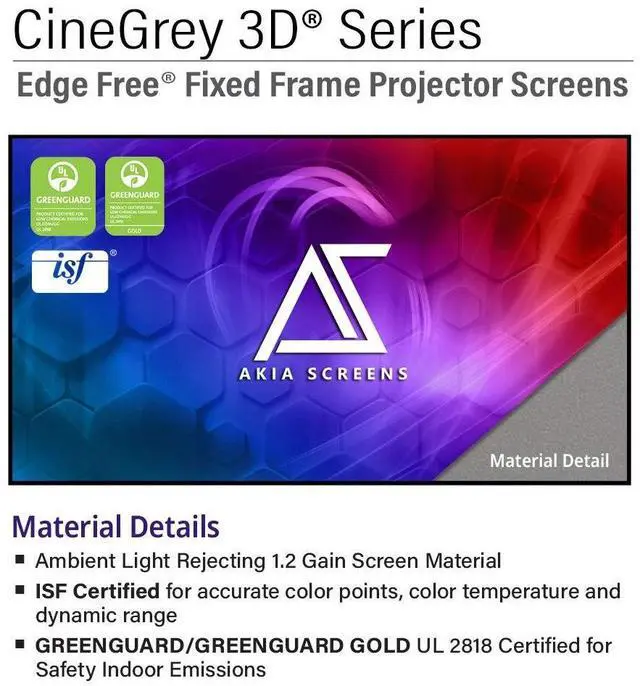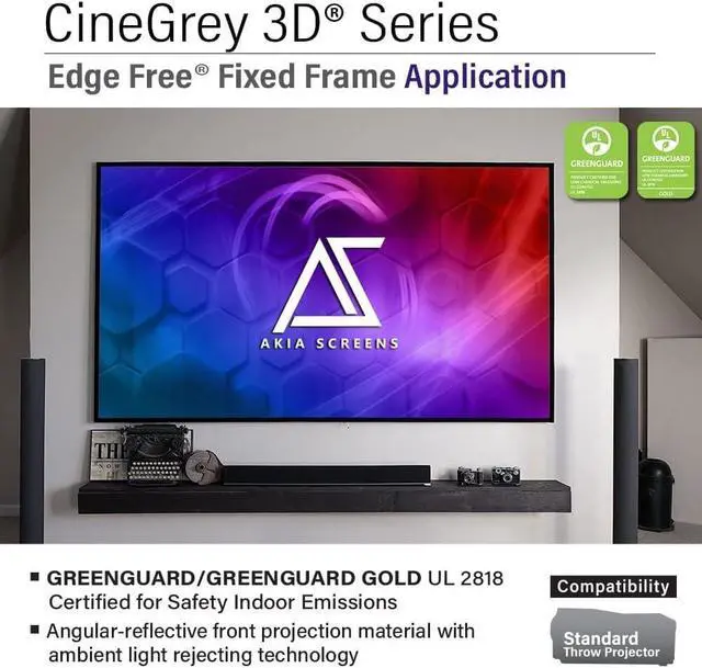 Ambient Light: CineGrey 3D material offers up to 65% ambient light rejection, helping maintain color saturation, black levels, and image brightness in family rooms, conference rooms, and game rooms. Ideal as a movie projector screen indoor solution for controlled-light environments. ^^ ISF & GREENGUARD Certified Flame Retardant: Complies with NFPA 701 Standards. ISF-certified material supports accurate color reproduction with minimal color shift and is UL 2818 GREENGUARD/GREENGUARD GOLD Certified for low chemical emissions. Supports 4K, 8K Ultra HD, Active 3D, and passive polarized 3D content, ideal for an indoor movie projector setup. ^^ Tensioned Frame with