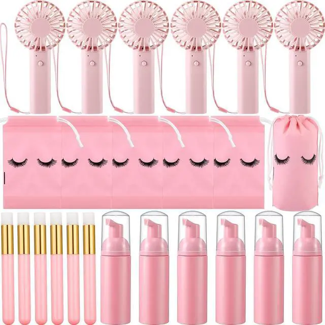includes: 6Pcs Handheld Usb Mini Portable Fans6Pcs Lash Shampoo Brush6Pcs Empty Shampoo Bottle6Pcs Drawstring