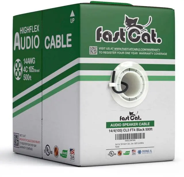 TAA-COMPLIANT & FLAMMABILITY RATED: Not only is fast Cat. 14/4 wire TAA-compliant and flammability rated, but our in wall speaker wire boasts an impressive CL3R & FT4 rating (higher than CL2 and CL3! ). Its also CMR and FT4 flammability rated so it complies with fire safety and insurance requirements that make it safe for use inside residential buildings. ^^