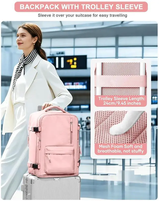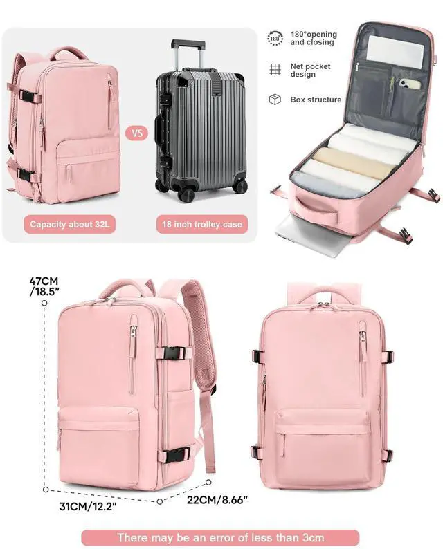 Large Capacity Multi-pocket BackpackThe Travel backpack with many compartments, holds about 32L. The main pocket can hold your travel goods, fit 5-8pcs clothes. Front compartment The front compartment with various pockets can be used to store notebooks, pens, earphones, and other small items, for quick pick out. The Travel Bag has a built-in laptop compartment that fits most 15-inch laptops and is situated close to your back. ^^ With Trolley Sleeve A trolley sleeve on the back allows the travel backpack to attaches to the handle of a carry-on luggage for hands-free transport, easier carrying.