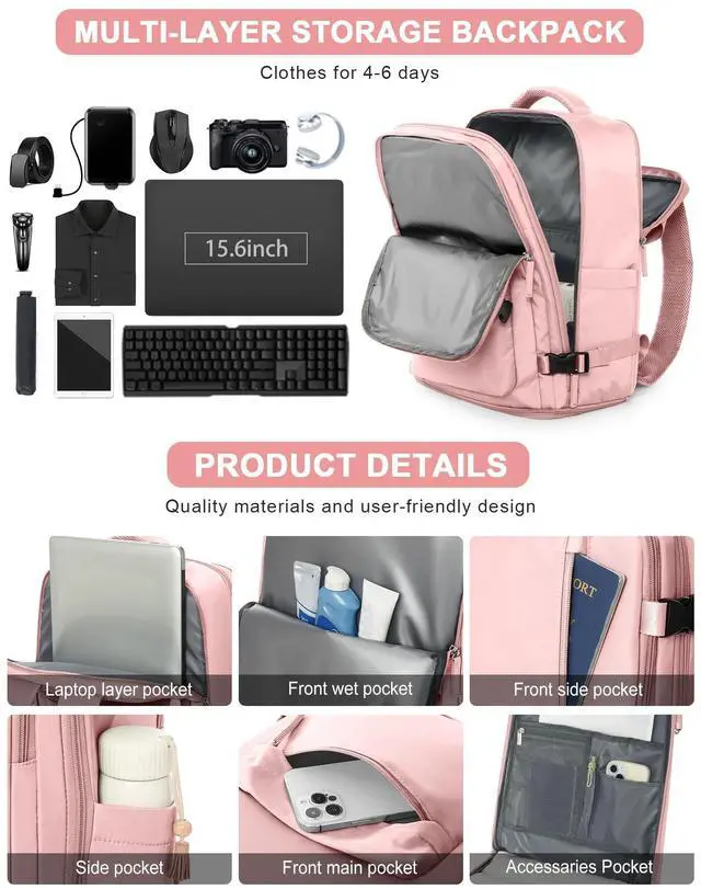 ^^ Separate Shoe Compartment and Wet Pocket There is a shoe compartment at the bottom of the backpack to separate your shoes from other items and keep them clean. The front wet pocket of the Flight Certified Travel Backpack is made of high-density material, which helps you separate dry items from wet items such as wet clothes or towels. ^^ Laptop CompartmentThe laptop compartment of the travel bag is a separate layer for easy access, fits most 15-inch laptops and fits snugly on the back. ^^ Adjustable Breathable Shoulder StrapsThe breathable shoulder straps and back of the laptop backpack are sturdy and durable, stable and comfortable to walk on, and help reduce back sweat.