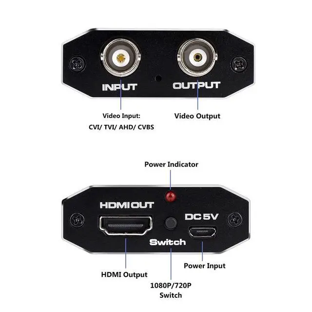 HDMI Output: Plug and play; It converts TVI CVI AHD CVBS security camera signals to HDMI monitor. ^^ The HDMI Video output is 1080p/720P@60Hz resolution, You can select by the switch. And It have BNC Video Loop Out port, that you can connect multiple monitors. 4K