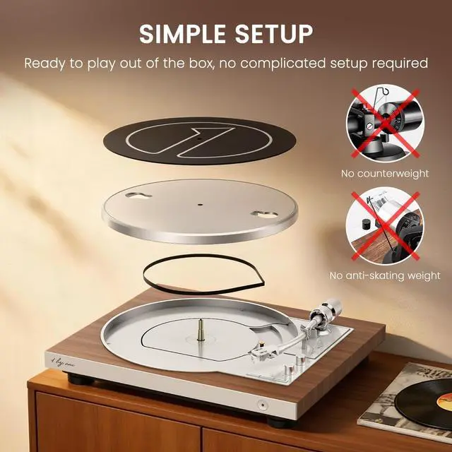 Set Up: Designed for true plug-and-play listening, this automatic record player is ready to play right out of the box with minimal setup needed. No counterweight balancing or tonearm adjustment neededideal for beginners ^^