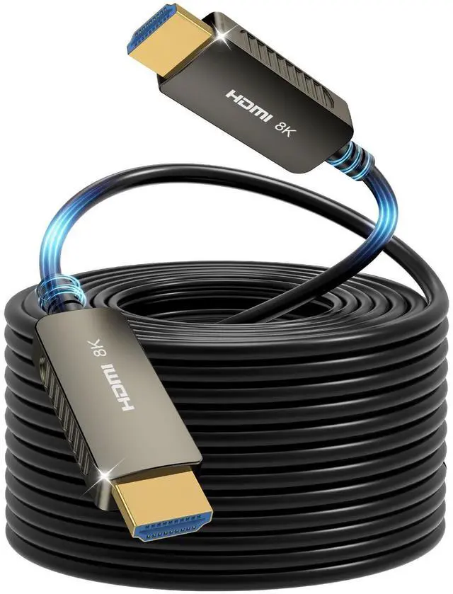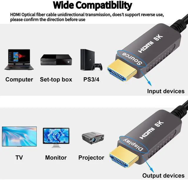 8K HDMI Fiber Optic CableOur 8K HDMI Fiber Optic cable is ultra high speed 48Gbps bandwidth ( 2.5 faster than HDMI 2.0 ), supporting 8K resolution, Dynamic HDR, and seamless 4K@120Hz playback. Universally compatible with PlayStation 5/4/3, Xbox Series X/S, Nintendo Switch, 8K/4K TVs, PCs, Blu-ray players, projectors, and more. ^^ Upgrade Revolution--HDMI 2.1T he 8K HDMI Fiber Optic cable conforms to the standard HDMI 2.1 version, supporting 8K@60Hz, 4K@120Hz, 48Gbps, HDCP 2.2, 4:4: 4, 16bit. It is compatible with all devices that adopt HDMI 2.1 standard and is backward compatible with previous versions, including HDMI 2.0, 1.4, 1.3, 1.2, and 1. ^^ Unidirectional TransmissionThis 8K HDMI Fiber Optic cable features Unidirectional transmission - please connect the SOURCEend (PC/PS5/XBox/Blu-ray) to your input device and the DISPLAYend (TV/monitor/projector) to your display. Incorrect connection will result in no signal output. ^^ Reinforced High-quality MaterialsThe 8K HDMI Fiber Optic cable features 24K gold-plated Type-A connectors and high-purity bare copper conductors for superior signal transmission. The durable PVC jacket ensures flexibility and longevity, while advanced shielding minimizes interference to prevent black screensdelivering crystal-clear 8K/4K video and immersive audio without compromise. ^^ HDMI Cable for Game EnthusiastsThis 8K HDMI Fiber Optic cable is not limited to 4K@60HZ, and can break through 4K to achieve 8K ultra-high image quality. It can also achieve an ultra-smooth picture of 4K@120HZ. Its latest game mode supports variable refresh rate, which maximizes the value of graphics card and CPU and is more accurate in rendering image processing.