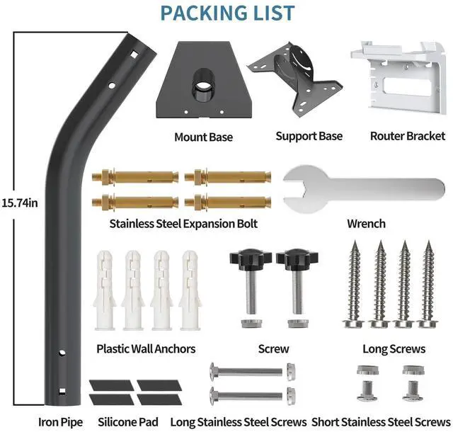^^ WHAT YOU GET: 1 x Metal Pipe, 1 x Mounting Base, 1 x Support Base, 1 x Router Mount, manual and installation accessories. If you have any questions, please feel free to contact us, we will answer you as soon as possible. ^^