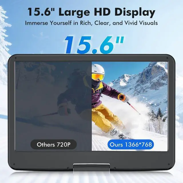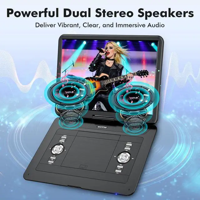 Immersive Viewing ExperienceWONNIE 18'' full-size portable dvd player with screen features a 15.6 inch 1366 768 LCD swivel screen, delivering sharper details, richer colors, and higher contrast. The 270 rotation and 180 flip design allow you to adjust the screen to get the most comfortable viewing angle while reducing eye fatigue ^^ 6-Hour Rechargeable Battery & 3 Power ModesEquipped with a high-capacity 5000mAh rechargeable battery, this portable video player provides up to 6 hours of continuous playback on a full charge. The portable movie player also includes a certified AC adapter and car charger, so your kids can stay entertained with their favorite cartoons during long journeys ^^ All Regions & Multi-formats SupportThe portable dvd player with large screen supports multiple formats.