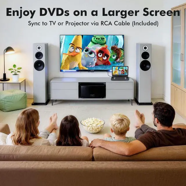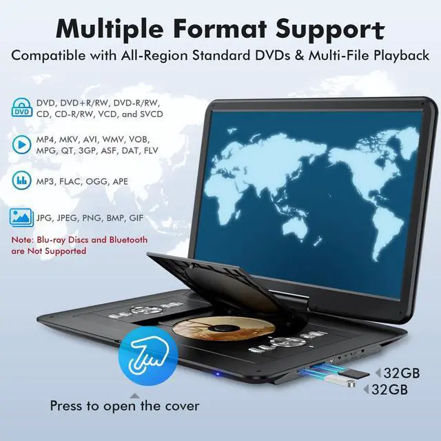 All-region disc formats: DVD, DVDR, DVDRW, CD, CD-R, CD-RW, VCD and SVCD. Supports USB 2.0 and SD/MMC cards up to 32GB (FAT32). This dvd player portable allows you to play a wide range of multimedia files, such as video (MP4, MKV, AVI, WMV, VOB, MPG, QT, 3GP, ASF, DAT, FLV), audio (MP3, FLAC, OGG, APE), and image (JPG, JPEG, PNG, BMP, GIF) ^^ Dual Powerful Stereo SpeakersThe dvd player with screen features dual high-performance speakers that deliver rich, stereo sound, immersing you in an audio-visual feast. You can also connect wired earphones, headphones or external speakers for louder and clearer audio ^^ Sync Screen to TV or ProjectorWant to enjoy a bigger screen? With the AV In/Out function, you can connect the dvd portable player to a TV using the provided RCA cable, sharing movies on a larger screen and enjoying a home theater experience with the whole family. Besides, you can sync screen with a projector or another similar player to play the same movie simultaneously via an AV cable (not included) ^^ Smooth Playback & Last Memory FunctionThe portable dvd player for kids adopts upgraded chip technology and advanced mechanisms, such as anti-shock protection and pre-reading, to ensure stable and uninterrupted playback.