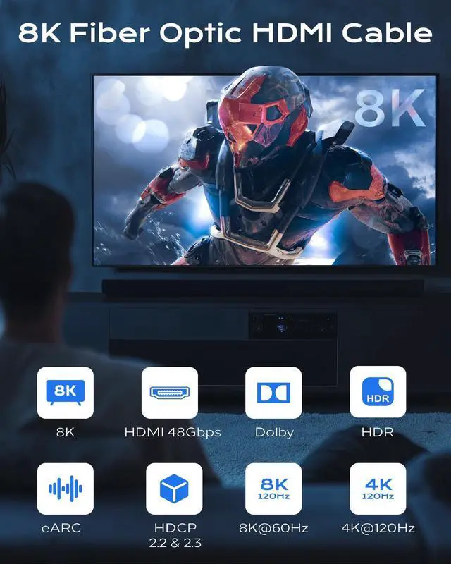 8K HD High Speed Performance - Experience seamless 8K@60Hz, 4K@120Hz, or 2K@240Hz resolution with this 48Gbps HDMI cable. 8K Fiber Optic HDMI cable 50FT, its backward compatible with HDMI 2.0 / 1.4 / 1.2 / 1.1 devices. ^^ Unidirectional Design Note the Connection - This 8k Fiber Optic HDMI Cable features a one-way transmission. Ensure the "SOURCE" end connects to your device (laptop, Blu-ray player, etc. ) and the "DISPLAY" end to your monitor/TV/projector. Incorrect placement will result in no signal. ^^ Advanced Fiber Optic Technology - Cratree HDMI cord Built with cutting-edge fiber optics and 4-layer shielding for low signal loss, superior anti-interference, and unmatched bandwidthfar outperforming traditional copper cables.
