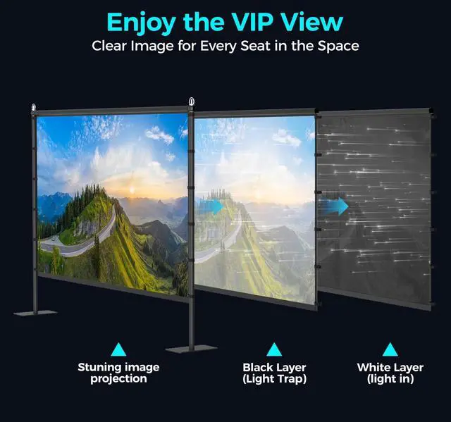 Upgraded Black Backing for Superior Picture QualityExperience a home theater revolution with our unique Black Backing Layer. This innovation absorbs ambient light and minimizes projection bleed-through, dramatically enhancing contrast for deeper blacks and more vibrant colors. Enjoy immersive, cinema-quality visuals in your backyard, living room, or at a campsite, even before full darkness.
