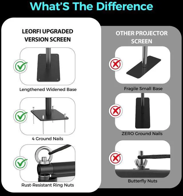 ^^ Professional Stability System: Fast Setup, Unshakable HoldAchieve rock-solid stability in minutes. Our upgraded, thickened base plate features four reinforced ground grommets, working with the included professional windproof kit (4 Ropes + 8 stakes) to create multiple anchor points against breezes. The top 304 stainless steel ring nuts provide a durable and easy-to-secure attachment for guylines, ensuring your large 120-inch screen stays perfectly taut and steady all night long. ^^ Premium Wrinkle-Free Fabric & Truly Portable DesignConstructed from high-grade, opaque projection material, our screen is inherently wrinkle-resistant and easy to maintain. The entire setup, including the screen, robust stand, and full stability kit, packs neatly into the included heavy-duty carry bag (45x20x20cm). At just 5kg total, its effortlessly portable for backyard movie nights, camping trips, parties, or presentations. ^^ Versatile Indoor & Outdoor Giant ScreenInstantly create a massive 120-inch, 16:9 viewing surface anywhere. This complete projection screen kit is ideal for outdoor movies under the stars, indoor home cinema nights, sports events, gaming, or backyard gatherings. It delivers exceptional performance with all standard projectors, turning any space into an entertainment hub.