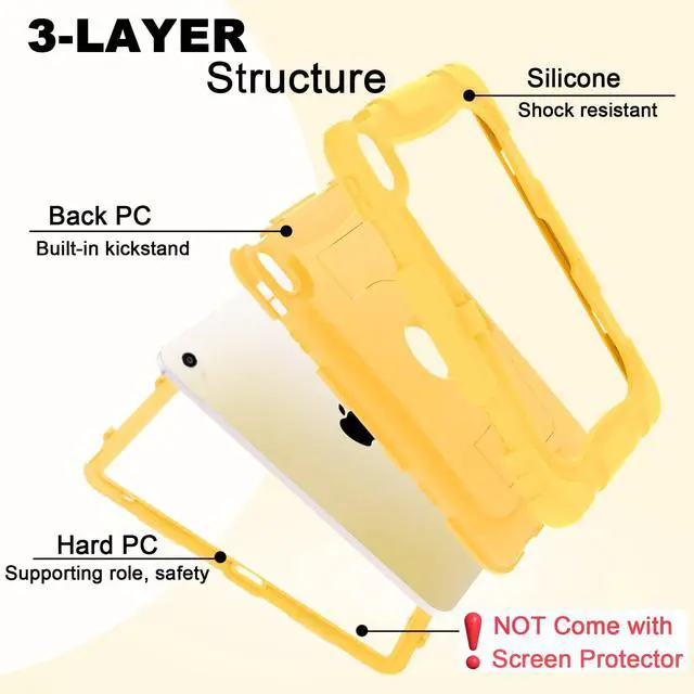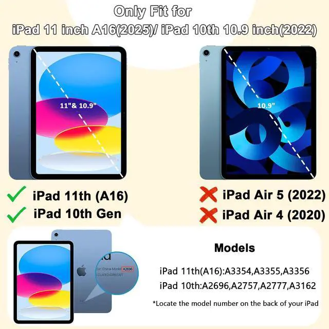 Model Specification Designed for iPad (A16) 11th generation 11 inch/ 10th generation 10.9 inch (Model includes: A3354/A3355/A3356/A2696/A2757/A2777/A3162) 2025/2022 released. Please check back bottom of your iPad to find the model number. ^^ Lager&Harder KickstandThis ipad 11th generation case kickstand features a dual-angle viewing with a reinforced, larger design for stronger stability, ensuring your iPad stays secure wherever you want to use it. Meanwhile, you can simply pop out the kickstand vertically to use it as a handle. This allows you to lift and transport the device effortlessly whenever required. ^^ Efficient Protection The 3-in-1 ipad case 11th generation has successfully passed the military collision test. It is made of high-quality silicone shell and durable hard PC back and front frame, which can effectively mitigates damage to your iPad caused by high-altitude drops, accidental falls, violent collisions. ^^ Precise Cutouts All controls of ipad a16 case are easily accessible for all iPad functions without removing your iPad from the case. The raised edges keep the screen and camera elevated to prevent scratches on surfaces. And the pen holder design provides a secure place for your pens to rest. ^^ Thoughtful serviceWe offer customer support at any time for our ipad 10th generation case.