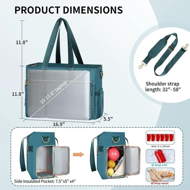 Insulated pocket size: 5'' x 4'' x 7.5 '' (Not fit for lunch Box). With this small food compartment, it is an ideal work companion for women. ^^ Large Capacity & All In 1: Our teacher tote bag equipped with 12 pockets, which can hold all your work necessities in an organized way. Fits up to 15.6 inches laptop, water bottles, umbrellas, and cosmetic products.