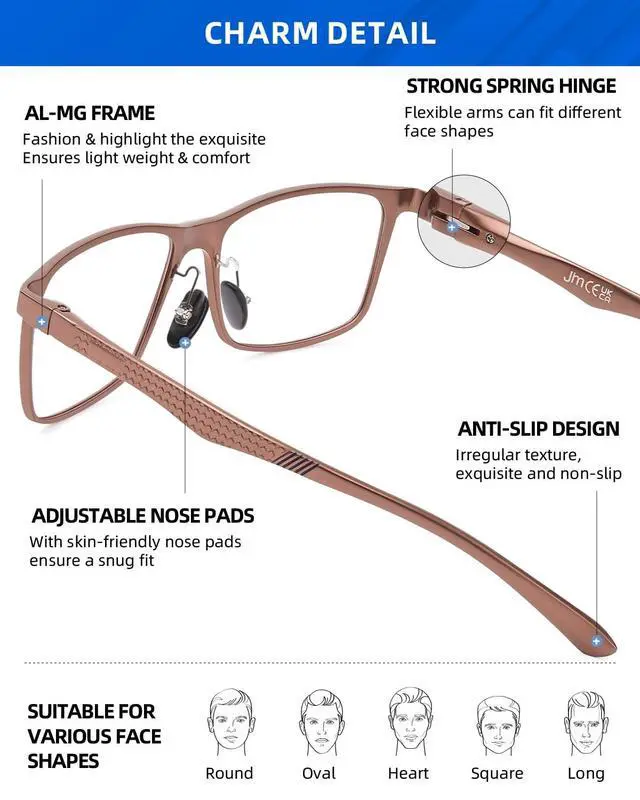 Al-Mg FrameJM men's women's blue light glasses are made of aluminum-magnesium alloy for excellent durability and lightness. The best rated blue light glasses is also resistant to oxidation and abrasion, extending the life of the product and allowing you to enjoy the protection of your blue light glasses for a long time. ^^ Ture Color Blue Light Blocking LensUnlike other bluelight glasses mens on the market with heavily tinted lens. JM low color distortion lens is optimised to provides the perfect balance between eye protection and viewing quality. ^^ Flexible Spring Hinge DesignDurable lightweight frame with adjustable spring hinge, suitable for long-term wearing and very comfortable, fit most face shapes.