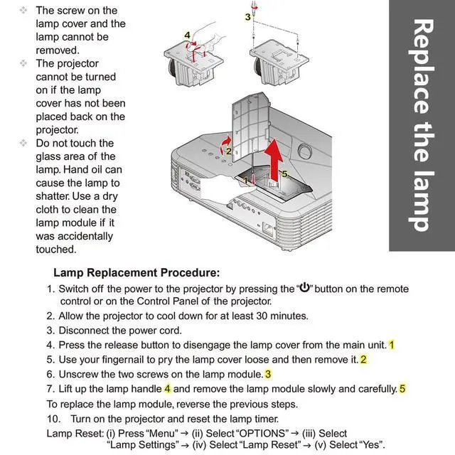 Install Your Projector Lamps: To install a projector lamp with the housing, just follow the easy steps below: 1. Make sure the projector is unplugged and sitting on a flat surface2. Loosen the screw holding the projector lamp module cover in place and remove the panel3. Unplug the old projector lamp and remove it from the projector4. Plug the new projector lamp securely into place5. Attach the panel back onto the projector and tighten the screw