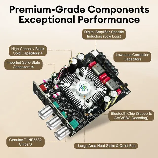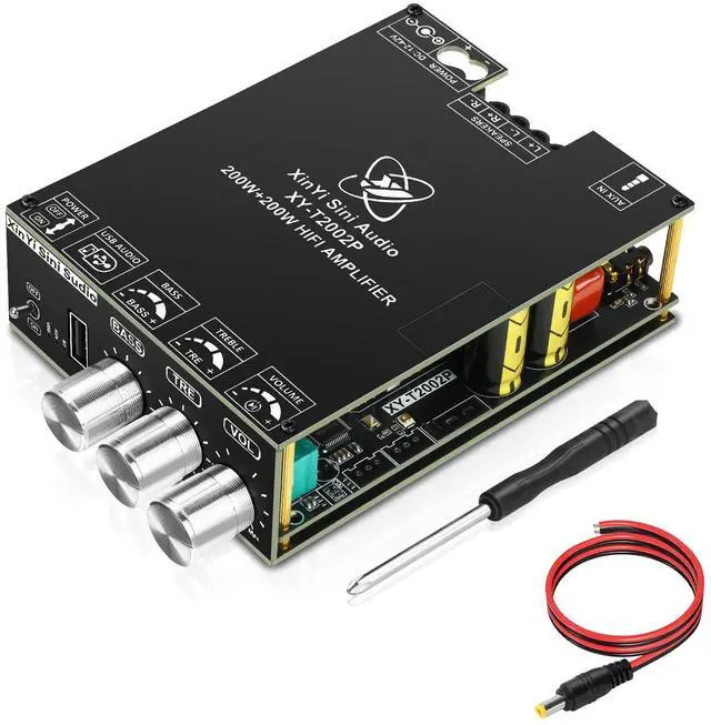 [Dual TPA3223 HiFi Chip]Daakro XY-T2002P Bluetooth Amplifier Board uses the original imported TPA3223 HiFi amplifier chip with PurePath technology for ultra-high resolution, ultra-low distortion and high-fidelity sound quality. Supports 2.0 -channel configuration, including left channel and right channel output. The left and right channels each provide 200W output power, creating an immersive sound experience. ^^ [Three Indicator Lights] The Daakro XY-T2002P Bluetooth Amplifier Module features three indicator lights that clearly display its operational status. The green light indicates USB mode, the red light indicates AUX mode, and the blue light indicates Bluetooth mode, enabling effortless control.