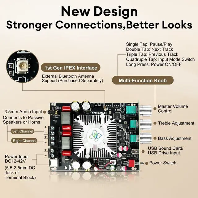 This thoughtful design simplifies module operation, helping you enjoy a high-quality music experience. ^^ [Multi-Function Master Volume Knob] The power amplifier module features a multi-function master volume knob. Rotate it to adjust the volume level. Click it to pause or play audio. Double-click it to skip to the next track. Triple-click it to return to the previous track. Quadruple-click it to switch modes, elevating your audio experience. The meticulously designed knob offers a smooth, comfortable feel, with all functions within easy reach. This enables you to fully immerse yourself in music and cinematic masterpieces.