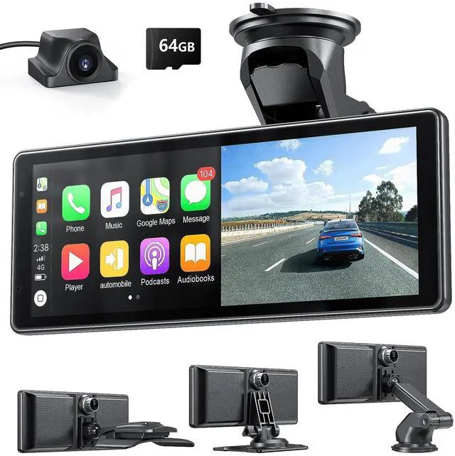 Siri & Google Assistant: This intelligent car stereo with Apple CarPlay supports full voice commands via Siri and Google Assistant. Manage navigation, calls, media, and more by voiceensuring both safety and convenience on every drive ^^ 4K Dashcam + 1080P Rear Camera Portable CarPlay with Built-In 64GB Storage The iK11 comes equipped with a 4K front dashcam and 1080P rear camera, providing comprehensive road coverage in both directions. This portable CarPlay system includes a pre-installed 64GB high-speed memory card, ensuring you can record and store footage right out of the box. With Wi-Fi video transfer, reviewing or saving clips to your phone is effortlessideal for safety, travel, and insurance needs. ^^ CarPlay with Backup Camera &