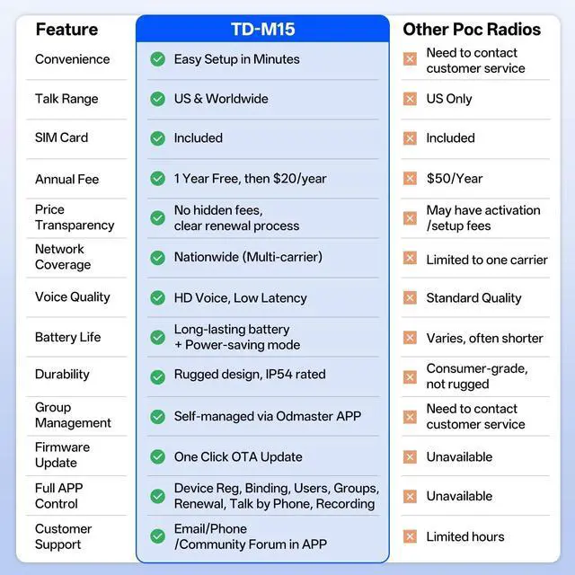 Whether you're in security, logistics, or event management, the TD-M15 adapts dynamically to your needs, providing a versatile and trustworthy communication solution for every scenario. ^^ Specially designed mobile phone APP--- Odmaster Never miss a critical communication with automatic recording Maintain contact across unprecedented distances-5000KM Constant OTA update build perfection into this radio. Reduce equipment costs with all-in-one functionality Enterprise-level security for Private communications ^^ [ ] The TIDRADIO TD-M15 represents our latest innovation in communication technology. Should you have any concerns or are not fully satisfied with your product, please reach out to us first.
