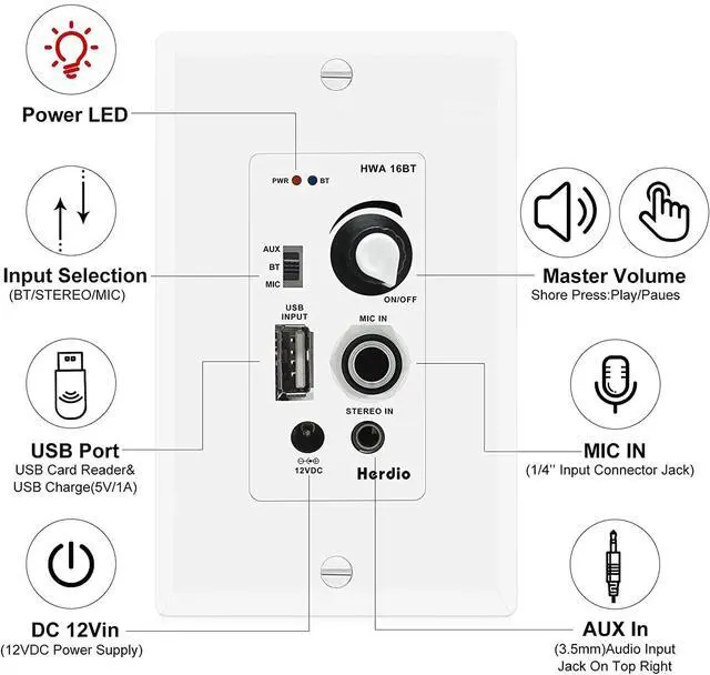 MIC IN /USB /AUX-IN: It features USB flash memory reader for media playback which also doubles as charging port for your devices. AUX 3.5 mm audio input jack lets you connect and stream audio from external devices, The Wall plate receiver adds convenient microphone paging ability along with sample source audio control. ^^
