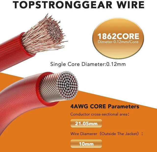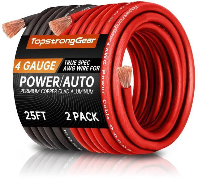 TURE 4 AWG GAUGE BLACK&RED POWER/GROUND WIRE-TopstrongGear 4 gauge 50-feet ( 15.24 m) red & black power/ground wire meets American Wire Gauge (AWG) standard, offering true-to-gauge quality that guarantees the necessary power flow for your wiring projects. Thicker wire presents less resistance to current flow. ^^ PREMIUM COPPER-CLAD ALUMINUM (CCA) WIRE CONTAINS 30% COPPER- Ensuring robust power transfer in a lightweight design. TopstrongGear CCA with 30% OFC wires maintain maximum flexibility while providing the strength needed for efficient power transfer at an affordable price point. For specific power demands, explore our range of premium Oxygen-Free Pure Copper (OFC) wiring alternatives.