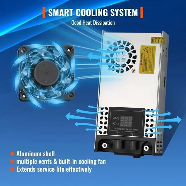 Dual Adjustable Voltage & Current (0-12V / 0-50A) Independently adjust both voltage (012V) and current (050A) with precise knobs, and monitor real-time values on the dual digital display. Tailor power output to match the exact needs of your devices. ^^ 6-Layer Safety Protection System 7-Built with short circuit, over-voltage, overload, earth leakage, overcurrent, and overheat protection to keep your devices and the power supply safe during demanding use. ^^ Efficient Smart Cooling for Longevity The aluminum alloy shell, multiple ventilation vents, and built-in cooling fan work together to dissipate heat quickly, preventing overheating and extending the lifespan of the unit.